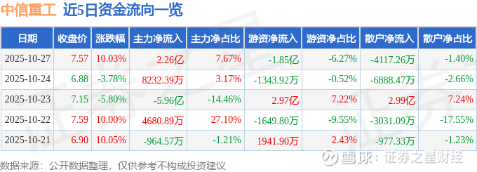 证券之星消息,中信重工10月27日涨停收盘,收盘价7.57元。该股于13点30分涨停,4次打开涨停,截止收盘封单资金为1451.19万元,占其流通市值0.04%。