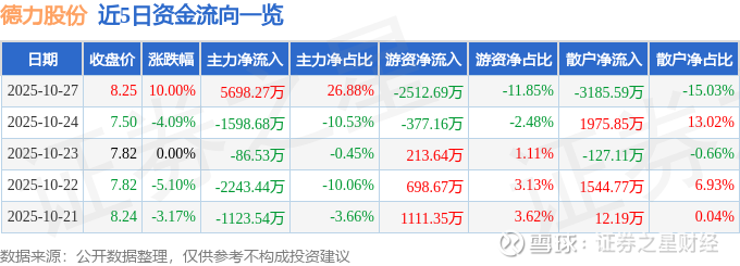 证券之星消息,德力股份10月27日涨停收盘,收盘价8.25元。该股于10点14分涨停,未打开涨停,截止收盘封单资金为1.87亿元,占其流通市值7.6%。