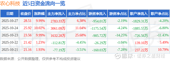 证券之星消息,农心科技10月27日涨停收盘,收盘价28.51元。该股于14点51分涨停,1次打开涨停,截止收盘封单资金为1145.66万元,占其流通市值0.81%。