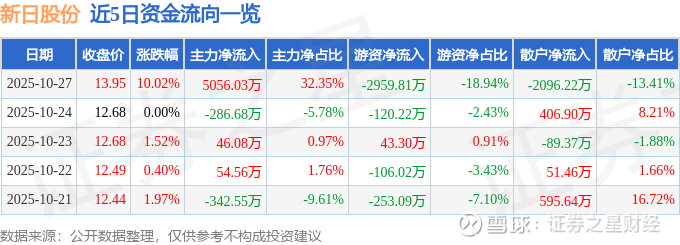 证券之星消息,新日股份10月27日涨停收盘,收盘价13.95元。该股于9点31分涨停,1次打开涨停,截止收盘封单资金为1747.1万元,占其流通市值0.54%。