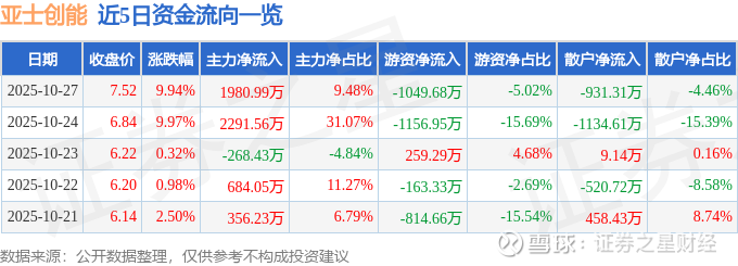 证券之星消息,亚士创能10月27日涨停收盘,收盘价7.52元。该股于9点25分涨停,2次打开涨停,截止收盘封单资金为6075.57万元,占其流通市值1.89%。