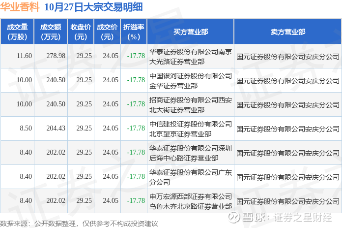 证券之星消息,10月27日华业香料发生大宗交易,交易数据如下:
