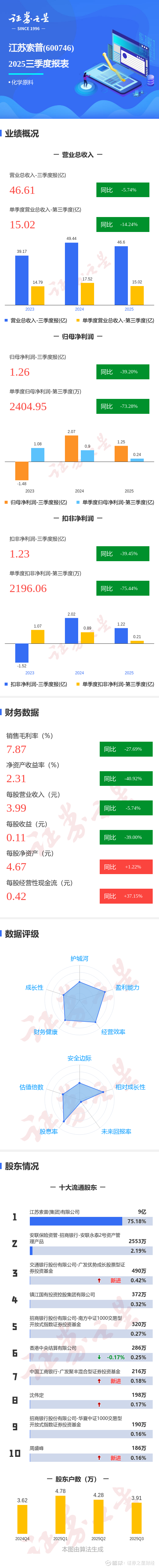 证券之星消息,江苏索普2025年三季报显示,公司主营收入46.61亿元,同比下降5.74%;归母净利润1.26亿元,同比下降39.21%;扣非净利润1.23亿元,同比下降39.46%;其中2025年第三季度,公司单季度主营收入15.02亿元,同比下降14.24%;单季度归母净利润2404.95万元,同比下降73.29%;单季度扣非净利润2196.06万元,同比下降75.44%;负债率20.04%,投资收益-155.92万元,财务费用-1127.66万元,毛利率7.87%。