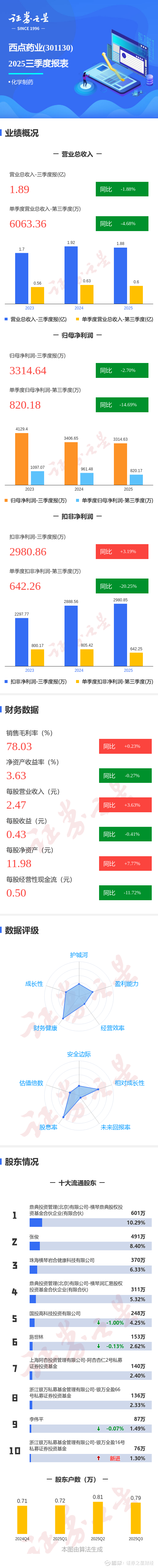 证券之星消息,西点药业2025年三季报显示,公司主营收入1.89亿元,同比下降1.89%;归母净利润3314.64万元,同比下降2.7%;扣非净利润2980.86万元,同比上升3.19%;其中2025年第三季度,公司单季度主营收入6063.36万元,同比下降4.68%;单季度归母净利润820.18万元,同比下降14.7%;单季度扣非净利润642.26万元,同比下降20.26%;负债率10.04%,投资收益255.29万元,财务费用-2.33万元,毛利率78.03%。