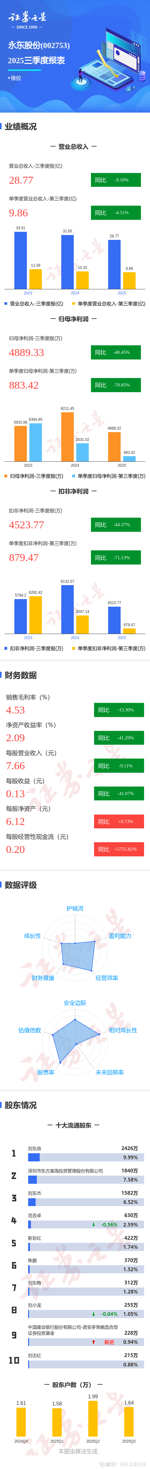 证券之星消息,永东股份2025年三季报显示,公司主营收入28.77亿元,同比下降9.11%;归母净利润4889.33万元,同比下降40.46%;扣非净利润4523.77万元,同比下降44.37%;其中2025年第三季度,公司单季度主营收入9.86亿元,同比下降4.51%;单季度归母净利润883.42万元,同比下降70.85%;单季度扣非净利润879.47万元,同比下降71.14%;负债率30.74%,投资收益459.09万元,财务费用2222.27万元,毛利率4.53%。