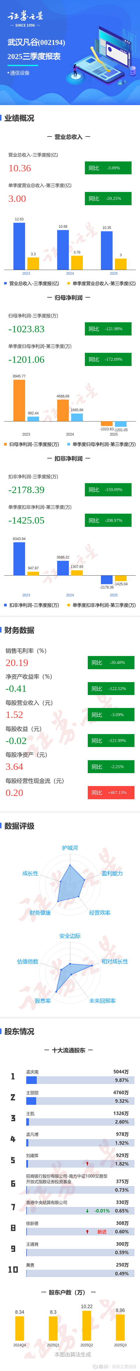 证券之星消息,武汉凡谷2025年三季报显示,公司主营收入10.36亿元,同比下降3.09%;归母净利润-1023.83万元,同比下降121.99%;扣非净利润-2178.39万元,同比下降159.09%;其中2025年第三季度,公司单季度主营收入3.0亿元,同比下降20.26%;单季度归母净利润-1201.06万元,同比下降172.1%;单季度扣非净利润-1425.05万元,同比下降208.98%;负债率14.22%,投资收益126.53万元,财务费用-860.6万元,毛利率20.19%。
