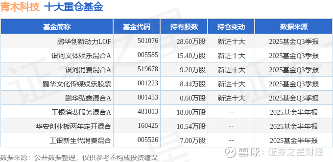 持有青木科技最多的基金为鹏华创新动力LOF,目前规模为3.19亿元,最新净值1.8218(10月27日),较上一交易日上涨1.78%,近一年上涨22.87%。该基金现任基金经理为李韵怡 萧嘉倩。