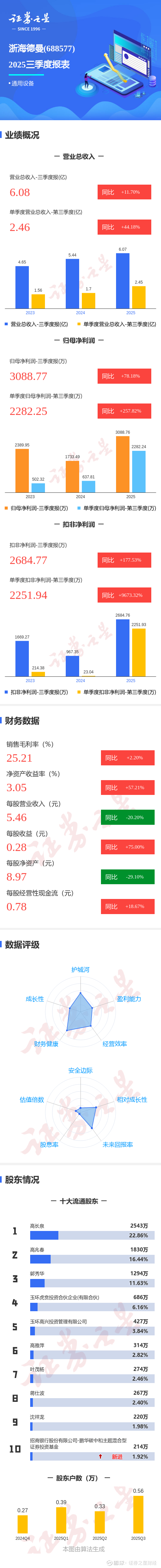 证券之星消息,浙海德曼2025年三季报显示,公司主营收入6.08亿元,同比上升11.71%;归母净利润3088.77万元,同比上升78.18%;扣非净利润2684.77万元,同比上升177.54%;其中2025年第三季度,公司单季度主营收入2.46亿元,同比上升44.18%;单季度归母净利润2282.25万元,同比上升257.82%;单季度扣非净利润2251.94万元,同比上升9673.33%;负债率39.7%,投资收益25.87万元,财务费用269.05万元,毛利率25.21%。
