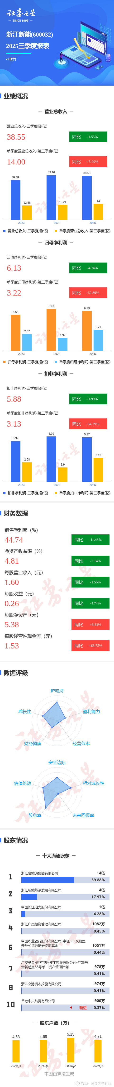 证券之星消息,浙江新能2025年三季报显示,公司主营收入38.55亿元,同比下降1.56%;归母净利润6.13亿元,同比下降4.74%;扣非净利润5.88亿元,同比下降2.0%;其中2025年第三季度,公司单季度主营收入14.0亿元,同比上升5.99%;单季度归母净利润3.22亿元,同比上升62.89%;单季度扣非净利润3.13亿元,同比上升64.39%;负债率67.1%,投资收益2.04亿元,财务费用7.15亿元,毛利率44.74%。