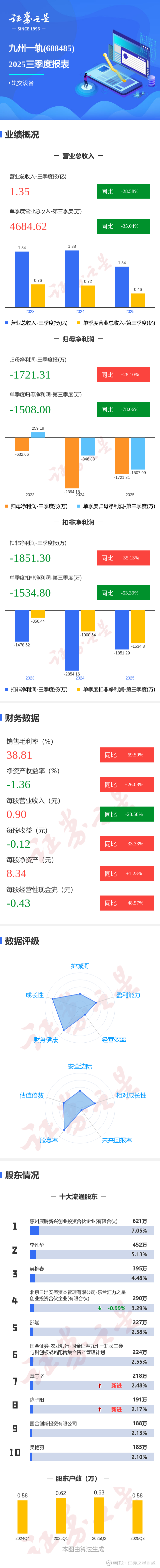 证券之星消息,九州一轨2025年三季报显示,公司主营收入1.35亿元,同比下降28.59%;归母净利润-1721.31万元,同比上升28.1%;扣非净利润-1851.3万元,同比上升35.14%;其中2025年第三季度,公司单季度主营收入4684.62万元,同比下降35.05%;单季度归母净利润-1508.0万元,同比下降78.07%;单季度扣非净利润-1534.8万元,同比下降53.4%;负债率11.44%,投资收益134.94万元,财务费用-435.94万元,毛利率38.81%。
