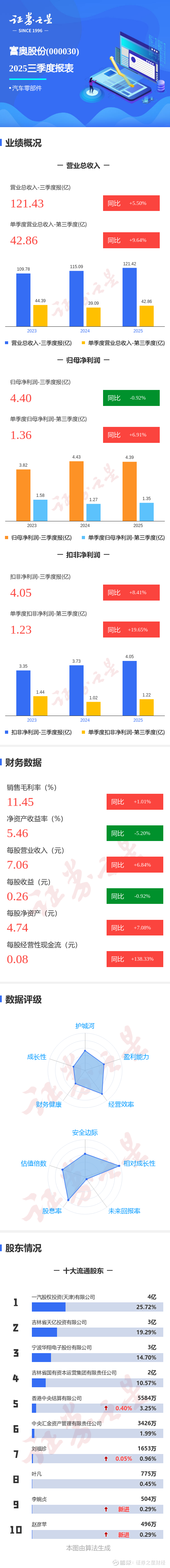 证券之星消息,富奥股份2025年三季报显示,公司主营收入121.43亿元,同比上升5.5%;归母净利润4.4亿元,同比下降0.92%;扣非净利润4.05亿元,同比上升8.42%;其中2025年第三季度,公司单季度主营收入42.86亿元,同比上升9.65%;单季度归母净利润1.36亿元,同比上升6.91%;单季度扣非净利润1.23亿元,同比上升19.66%;负债率48.04%,投资收益3.55亿元,财务费用714.44万元,毛利率11.45%。