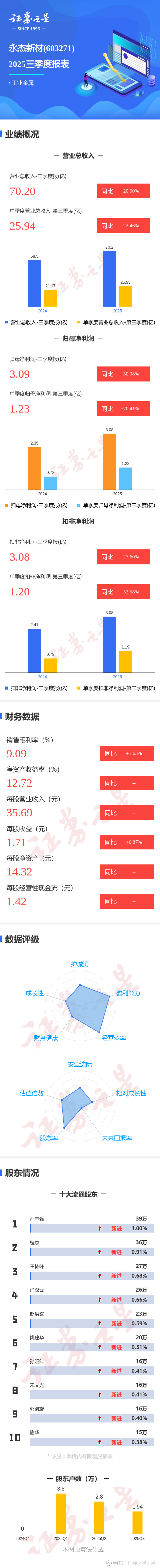 证券之星消息,永杰新材2025年三季报显示,公司主营收入70.2亿元,同比上升20.01%;归母净利润3.09亿元,同比上升30.99%;扣非净利润3.08亿元,同比上升27.6%;其中2025年第三季度,公司单季度主营收入25.94亿元,同比上升22.46%;单季度归母净利润1.23亿元,同比上升70.41%;单季度扣非净利润1.2亿元,同比上升53.58%;负债率41.56%,投资收益-1601.11万元,财务费用91.51万元,毛利率9.09%。