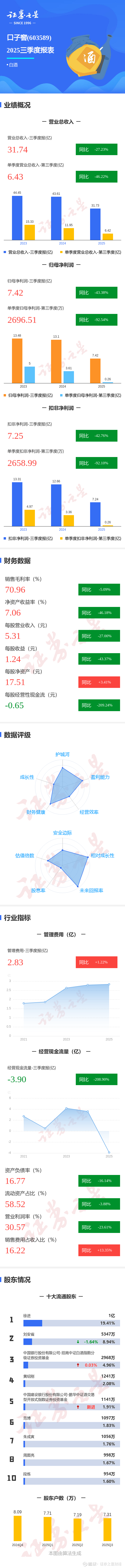 证券之星消息,口子窖2025年三季报显示,公司主营收入31.74亿元,同比下降27.24%;归母净利润7.42亿元,同比下降43.39%;扣非净利润7.25亿元,同比下降42.77%;其中2025年第三季度,公司单季度主营收入6.43亿元,同比下降46.23%;单季度归母净利润2696.51万元,同比下降92.55%;单季度扣非净利润2658.99万元,同比下降92.1%;负债率16.77%,投资收益1923.95万元,财务费用-3484.5万元,毛利率70.96%。