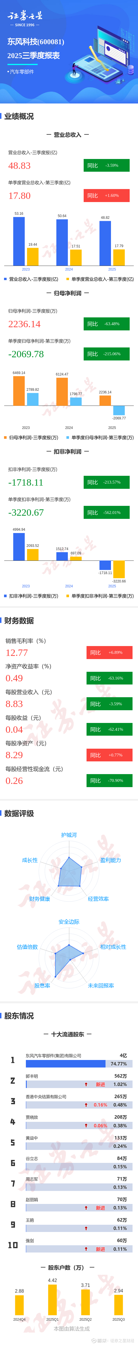 证券之星消息,东风科技2025年三季报显示,公司主营收入48.83亿元,同比下降3.59%;归母净利润2236.14万元,同比下降63.49%;扣非净利润-1718.11万元,同比下降213.58%;其中2025年第三季度,公司单季度主营收入17.8亿元,同比上升1.6%;单季度归母净利润-2069.78万元,同比下降215.07%;单季度扣非净利润-3220.67万元,同比下降562.01%;负债率45.22%,投资收益1.25亿元,财务费用-1099.81万元,毛利率12.77%。