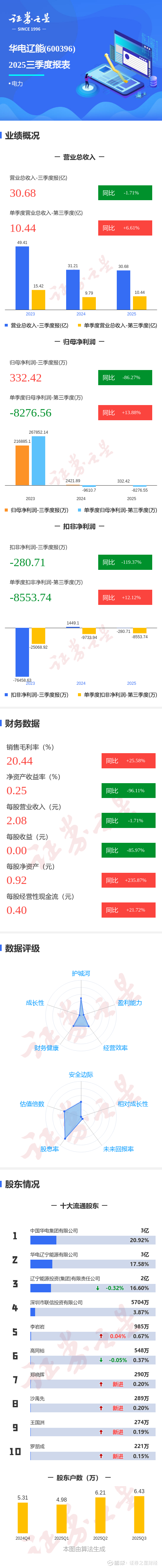 证券之星消息,华电辽能2025年三季报显示,公司主营收入30.68亿元,同比下降1.72%;归母净利润332.42万元,同比下降86.27%;扣非净利润-280.71万元,同比下降119.37%;其中2025年第三季度,公司单季度主营收入10.44亿元,同比上升6.61%;单季度归母净利润-8276.56万元,同比上升13.88%;单季度扣非净利润-8553.74万元,同比上升12.12%;负债率68.62%,投资收益-2144.26万元,财务费用1.72亿元,毛利率20.44%。