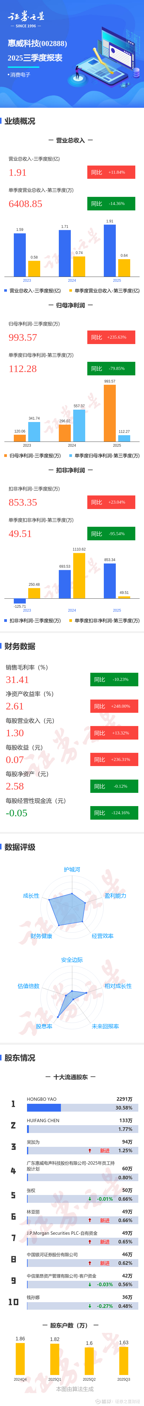证券之星消息,惠威科技2025年三季报显示,公司主营收入1.91亿元,同比上升11.84%;归母净利润993.57万元,同比上升235.64%;扣非净利润853.35万元,同比上升23.04%;其中2025年第三季度,公司单季度主营收入6408.85万元,同比下降14.36%;单季度归母净利润112.28万元,同比下降79.86%;单季度扣非净利润49.51万元,同比下降95.54%;负债率14.91%,投资收益229.13万元,财务费用-1.7万元,毛利率31.41%。