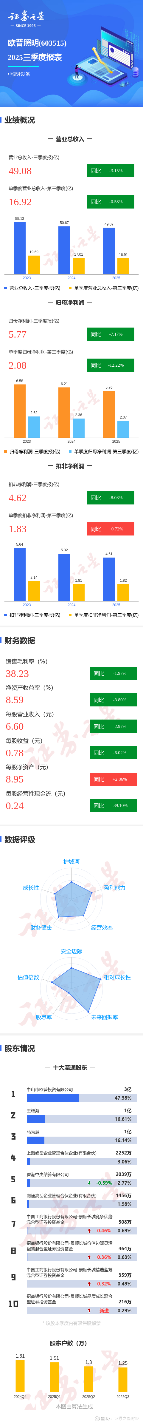 证券之星消息,欧普照明2025年三季报显示,公司主营收入49.08亿元,同比下降3.16%;归母净利润5.77亿元,同比下降7.17%;扣非净利润4.62亿元,同比下降8.03%;其中2025年第三季度,公司单季度主营收入16.92亿元,同比下降0.59%;单季度归母净利润2.08亿元,同比下降12.22%;单季度扣非净利润1.83亿元,同比上升0.73%;负债率28.16%,投资收益3763.79万元,财务费用-3023.79万元,毛利率38.23%。