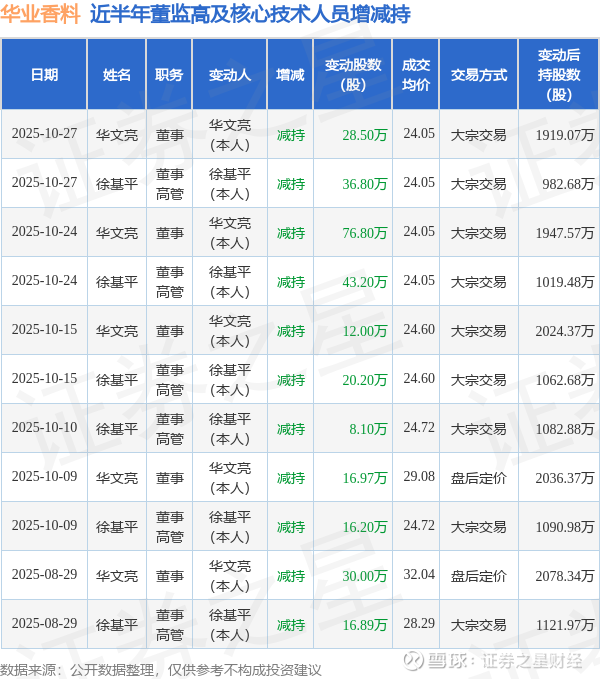 证券之星消息,根据10月28日市场公开信息、上市公司公告及交易所披露数据整理,华业香料(300886)最新董监高及相关人员股份变动情况:2025年10月27日公司董事华文亮、董事,高管徐基平共减持公司股份65.3万股,占公司总股本为0.873%。变动期间公司股价上涨0.93%,10月27日当日收盘报29.25元。