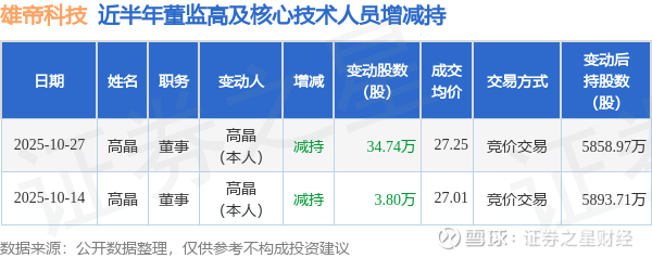 雄帝科技近半年内的董监高及核心技术人员增减持详情如下: