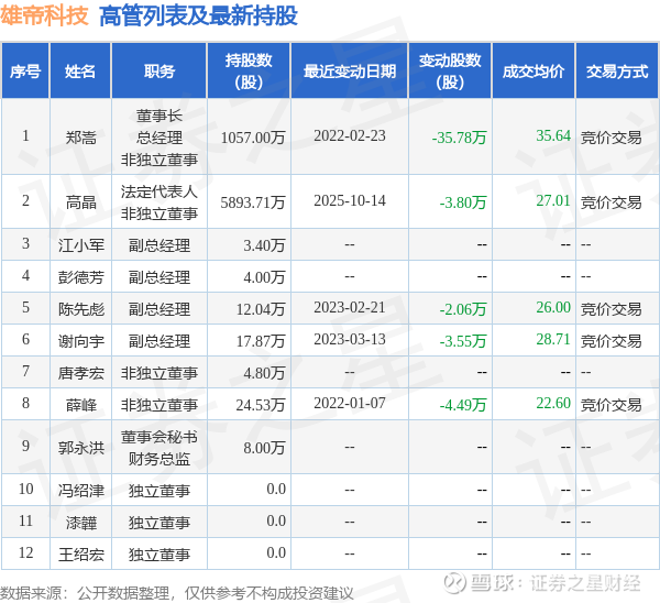 雄帝科技的高管列表及最新持股情况如下: