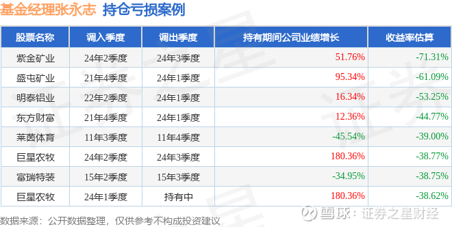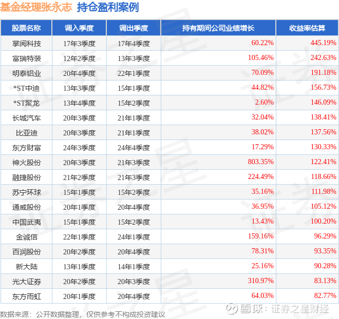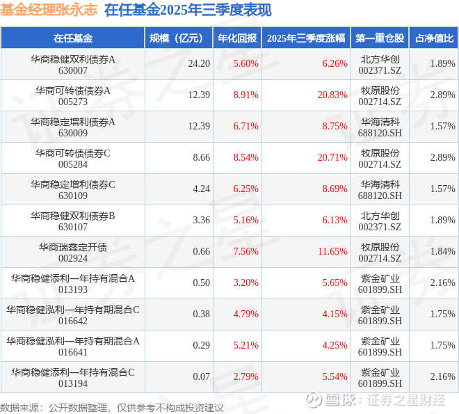重仓股调仓示例详解:1、掌阅科技(603533)翻倍案例:张永志管理的华商瑞丰短债债券A基金在17年3季度买入掌阅科技,在持有1个季度后在17年4季度卖出。持有期间的估算收益率为445.19%,持有期间掌阅科技在2016年到2017年的年报归属净利润增幅达60.22%。2、金诚信(603979)调仓案例:张永志管理的华商收益增强债券A基金在22年1季度买入金诚信,在持有2年又0个季度后在24年1季度卖出。持有期间的估算收益率为96.29%,持有期间金诚信在2022年到2024年的年报归属净利润增幅达159.16%。3、紫金矿业(601899)折戟案例:张永志管理的华商可转债债券A基金在24年2季度买入紫金矿业,在持有1个季度后在24年3季度卖出。持有期间的估算收益率为-71.31%,持有期间紫金矿业在2023年到2024年的年报归属净利润增幅达51.76%。