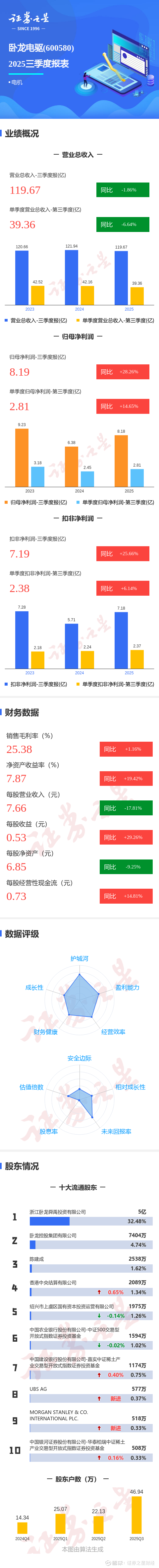 证券之星消息,卧龙电驱2025年三季报显示,公司主营收入119.67亿元,同比下降1.86%;归母净利润8.19亿元,同比上升28.26%;扣非净利润7.19亿元,同比上升25.66%;其中2025年第三季度,公司单季度主营收入39.36亿元,同比下降6.64%;单季度归母净利润2.81亿元,同比上升14.65%;单季度扣非净利润2.38亿元,同比上升6.14%;负债率55.24%,投资收益4770.27万元,财务费用8540.66万元,毛利率25.38%。