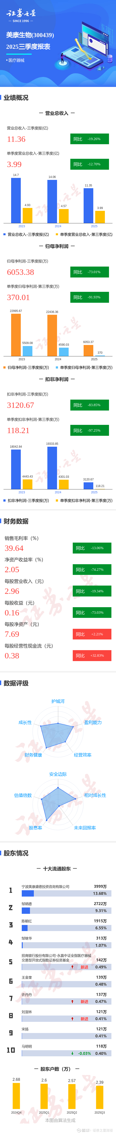 证券之星消息,美康生物2025年三季报显示,公司主营收入11.36亿元,同比下降19.27%;归母净利润6053.38万元,同比下降73.02%;扣非净利润3120.67万元,同比下降83.86%;其中2025年第三季度,公司单季度主营收入3.99亿元,同比下降12.71%;单季度归母净利润370.01万元,同比下降91.94%;单季度扣非净利润118.21万元,同比下降97.25%;负债率19.34%,投资收益237.23万元,财务费用-186.97万元,毛利率39.64%。