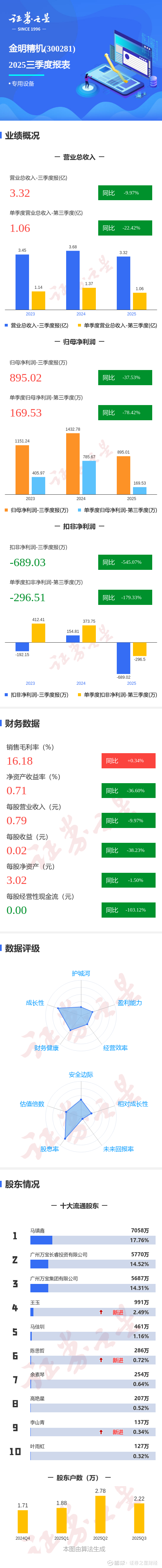 证券之星消息,金明精机2025年三季报显示,公司主营收入3.32亿元,同比下降9.97%;归母净利润895.02万元,同比下降37.53%;扣非净利润-689.03万元,同比下降545.08%;其中2025年第三季度,公司单季度主营收入1.06亿元,同比下降22.43%;单季度归母净利润169.53万元,同比下降78.42%;单季度扣非净利润-296.51万元,同比下降179.33%;负债率14.89%,投资收益404.42万元,财务费用-39.83万元,毛利率16.18%。