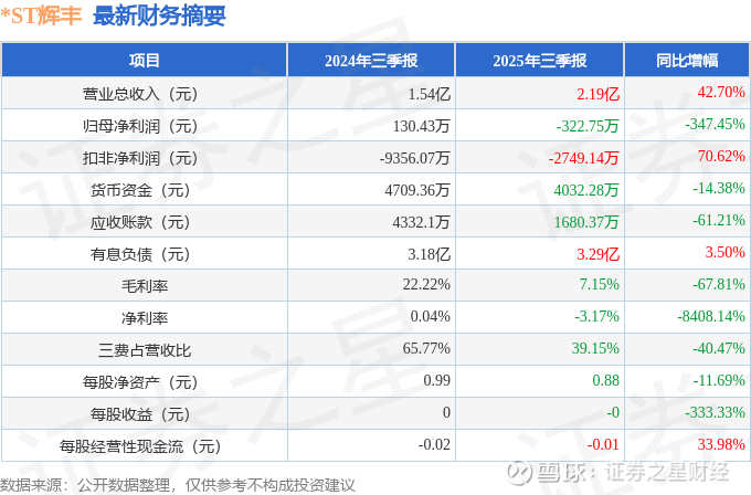 据证券之星公开数据整理,近期*ST辉丰(002496)发布2025年三季报。根据财报显示,*ST辉丰增收不增利。截至本报告期末,公司营业总收入2.19亿元,同比上升42.7%,归母净利润-322.75万元,同比下降347.45%。按单季度数据看,第三季度营业总收入6210.27万元,同比上升42.95%,第三季度归母净利润-1469.28万元,同比上升56.08%。