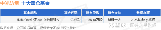 持有中光防雷最多的基金为华泰柏瑞中证2000指数增强A,目前规模为3.12亿元,最新净值1.7465(10月28日),较上一交易日上涨0.11%,近一年上涨64.31%。该基金现任基金经理为盛豪 孔令烨 雷文渊。