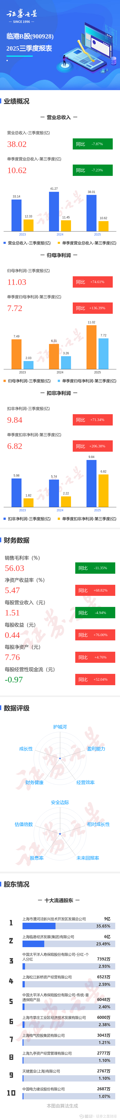 证券之星消息,临港B股2025年三季报显示,公司主营收入38.02亿元,同比下降7.88%;归母净利润11.03亿元,同比上升74.61%;扣非净利润9.84亿元,同比上升71.34%;其中2025年第三季度,公司单季度主营收入10.62亿元,同比下降7.24%;单季度归母净利润7.72亿元,同比上升136.4%;单季度扣非净利润6.82亿元,同比上升206.39%;负债率60.36%,投资收益7.99亿元,财务费用4.55亿元,毛利率56.03%。