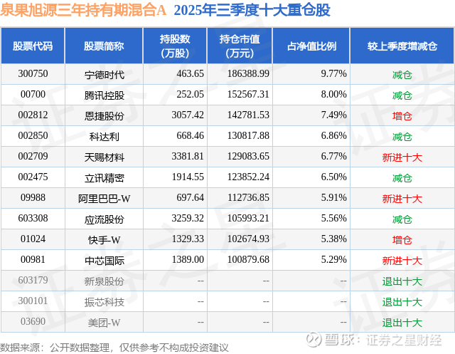 根据2025基金Q3季报公募基金重仓股数据,重仓该股的公募基金共24家,其中持有数量最多的公募基金为泉果基金的泉果旭源三年持有期混合A。泉果旭源三年持有期混合A目前规模为163.29亿元,最新净值1.1004(10月28日),较上一交易日下跌0.07%,近一年上涨37.46%。该公募基金现任基金经理为赵诣。