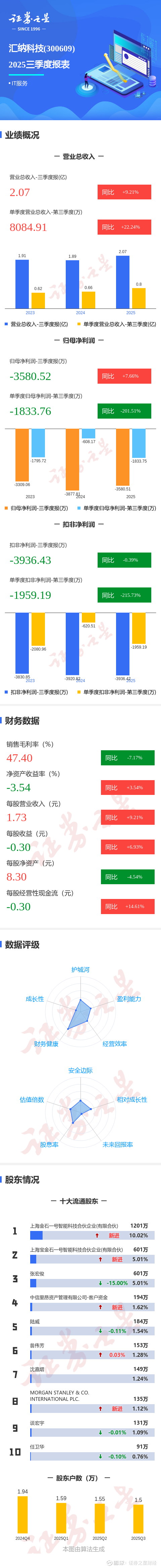 证券之星消息,汇纳科技2025年三季报显示,前三季度公司主营收入2.07亿元,同比上升9.21%;归母净利润-3580.52万元,同比上升7.67%;扣非净利润-3936.43万元,同比下降0.4%;其中2025年第三季度,公司单季度主营收入8084.91万元,同比上升22.25%;单季度归母净利润-1833.76万元,同比下降201.52%;单季度扣非净利润-1959.19万元,同比下降215.74%;负债率17.41%,投资收益-109.49万元,财务费用-128.0万元,毛利率47.4%。