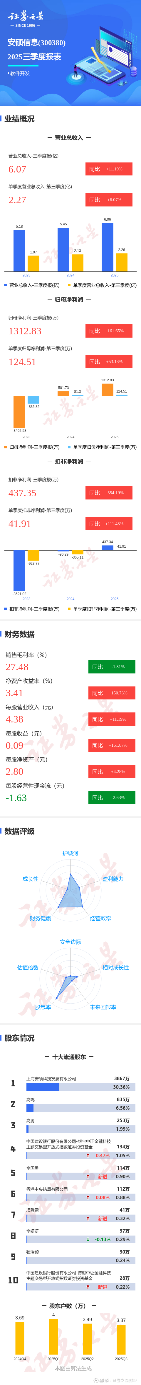 证券之星消息,安硕信息2025年三季报显示,前三季度公司主营收入6.07亿元,同比上升11.19%;归母净利润1312.83万元,同比上升161.66%;扣非净利润437.35万元,同比上升554.19%;其中2025年第三季度,公司单季度主营收入2.27亿元,同比上升6.07%;单季度归母净利润124.51万元,同比上升53.14%;单季度扣非净利润41.91万元,同比上升111.48%;负债率65.49%,投资收益33.3万元,财务费用487.51万元,毛利率27.48%。
