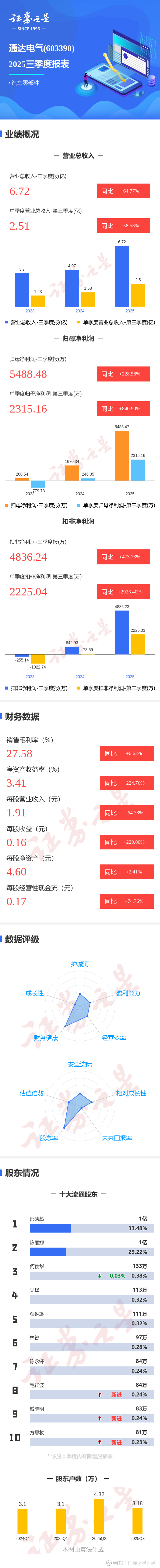 证券之星消息,通达电气2025年三季报显示,前三季度公司主营收入6.72亿元,同比上升64.78%;归母净利润5488.48万元,同比上升228.58%;扣非净利润4836.24万元,同比上升473.73%;其中2025年第三季度,公司单季度主营收入2.51亿元,同比上升58.54%;单季度归母净利润2315.16万元,同比上升840.91%;单季度扣非净利润2225.04万元,同比上升2923.41%;负债率14.71%,投资收益65.84万元,财务费用-14.77万元,毛利率27.58%。