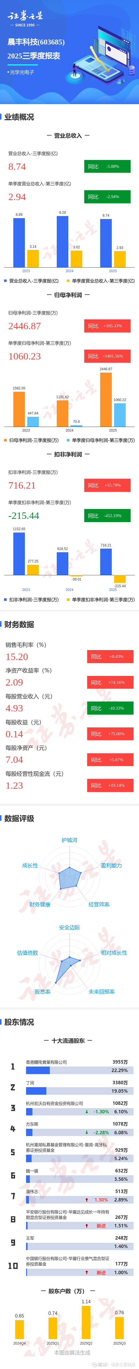 证券之星消息,晨丰科技2025年三季报显示,前三季度公司主营收入8.74亿元,同比下降5.89%;归母净利润2446.87万元,同比上升105.34%;扣非净利润716.21万元,同比上升15.79%;其中2025年第三季度,公司单季度主营收入2.94亿元,同比下降2.95%;单季度归母净利润1060.23万元,同比上升1401.57%;单季度扣非净利润-215.44万元,同比下降452.19%;负债率62.62%,投资收益1484.69万元,财务费用4633.92万元,毛利率15.2%。