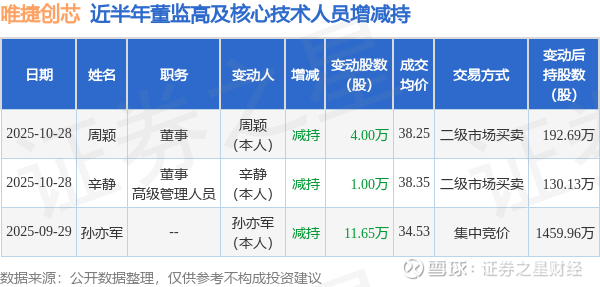证券之星消息,根据10月29日市场公开信息、上市公司公告及交易所披露数据整理,唯捷创芯(688153)最新董监高及相关人员股份变动情况:2025年10月28日公司董事周颖、董事,高级管理人员辛静共减持公司股份5.0万股,占公司总股本为0.0116%。变动期间公司股价上涨4.23%,10月28日当日收盘报37.47元。