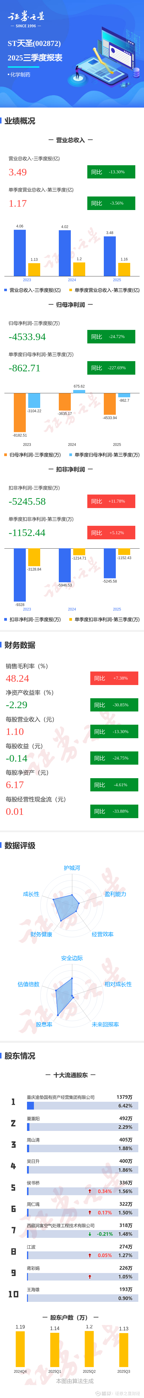 证券之星消息,ST天圣2025年三季报显示,前三季度公司主营收入3.49亿元,同比下降13.31%;归母净利润-4533.94万元,同比下降24.72%;扣非净利润-5245.58万元,同比上升11.79%;其中2025年第三季度,公司单季度主营收入1.17亿元,同比下降3.57%;单季度归母净利润-862.71万元,同比下降227.69%;单季度扣非净利润-1152.44万元,同比上升5.13%;负债率25.64%,投资收益132.21万元,财务费用589.05万元,毛利率48.24%。