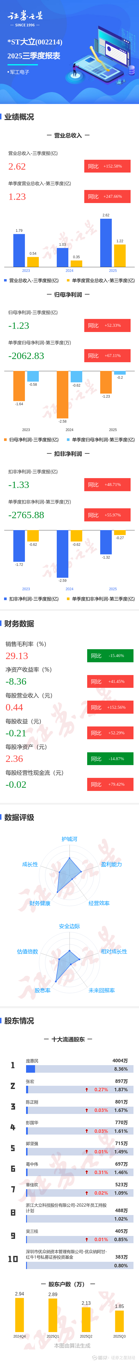 证券之星消息,*ST大立2025年三季报显示,前三季度公司主营收入2.62亿元,同比上升152.59%;归母净利润-1.23亿元,同比上升52.33%;扣非净利润-1.33亿元,同比上升48.72%;其中2025年第三季度,公司单季度主营收入1.23亿元,同比上升247.67%;单季度归母净利润-2062.83万元,同比上升67.11%;单季度扣非净利润-2765.88万元,同比上升55.97%;负债率34.35%,投资收益-8.54万元,财务费用674.74万元,毛利率29.13%。