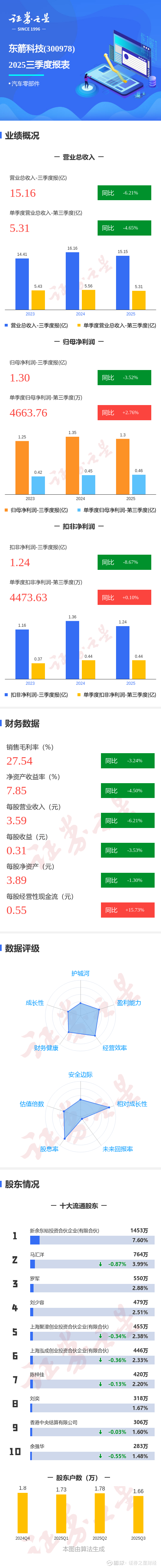 证券之星消息,东箭科技2025年三季报显示,前三季度公司主营收入15.16亿元,同比下降6.21%;归母净利润1.3亿元,同比下降3.53%;扣非净利润1.24亿元,同比下降8.67%;其中2025年第三季度,公司单季度主营收入5.31亿元,同比下降4.66%;单季度归母净利润4663.76万元,同比上升2.77%;单季度扣非净利润4473.63万元,同比上升0.11%;负债率36.54%,投资收益391.3万元,财务费用-57.51万元,毛利率27.54%。