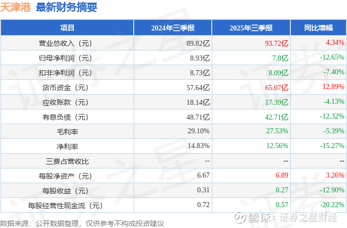 据证券之星公开数据整理,近期天津港(600717)发布2025年三季报。截至本报告期末,公司营业总收入93.72亿元,同比上升4.34%,归母净利润7.8亿元,同比下降12.65%。按单季度数据看,第三季度营业总收入31.94亿元,同比上升4.36%,第三季度归母净利润2.77亿元,同比下降0.0%。本报告期天津港公司应收账款体量较大,当期应收账款占最新年报归母净利润比达175.06%。