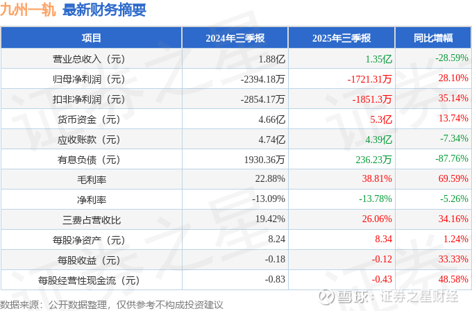 据证券之星公开数据整理,近期九州一轨(688485)发布2025年三季报。截至本报告期末,公司营业总收入1.35亿元,同比下降28.59%,归母净利润-1721.31万元,同比上升28.1%。按单季度数据看,第三季度营业总收入4684.62万元,同比下降35.05%,第三季度归母净利润-1508.0万元,同比下降78.07%。本报告期九州一轨公司应收账款体量较大,当期应收账款占最新年报归母净利润比达3934.34%。