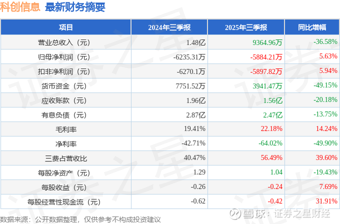 据证券之星公开数据整理,近期科创信息(300730)发布2025年三季报。截至本报告期末,公司营业总收入9364.96万元,同比下降36.58%,归母净利润-5884.21万元,同比上升5.63%。按单季度数据看,第三季度营业总收入3958.51万元,同比上升21.46%,第三季度归母净利润-779.22万元,同比上升65.08%。本报告期科创信息三费占比上升明显,财务费用、销售费用和管理费用总和占总营收同比增幅达33.03%。