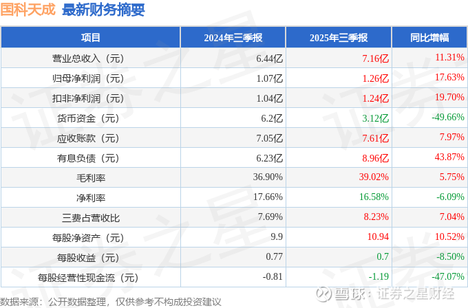 据证券之星公开数据整理,近期国科天成(301571)发布2025年三季报。截至本报告期末,公司营业总收入7.16亿元,同比上升11.31%,归母净利润1.26亿元,同比上升17.63%。按单季度数据看,第三季度营业总收入3.1亿元,同比上升16.25%,第三季度归母净利润5861.07万元,同比上升17.93%。本报告期国科天成公司应收账款体量较大,当期应收账款占最新年报归母净利润比达440.88%。