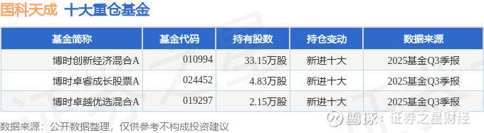 持有国科天成最多的基金为博时创新经济混合A,目前规模为4.01亿元,最新净值1.3007(10月29日),较上一交易日上涨0.29%,近一年上涨42.86%。该基金现任基金经理为田俊维。