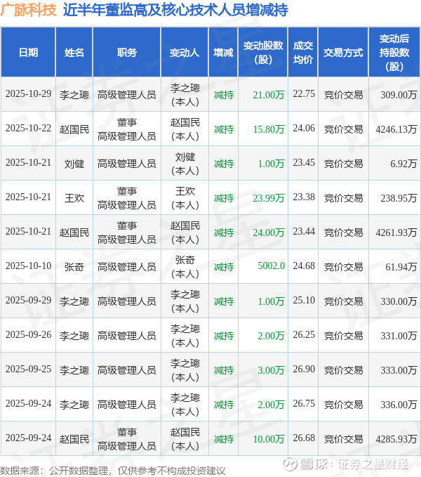 广脉科技近半年内的董监高及核心技术人员增减持详情如下: