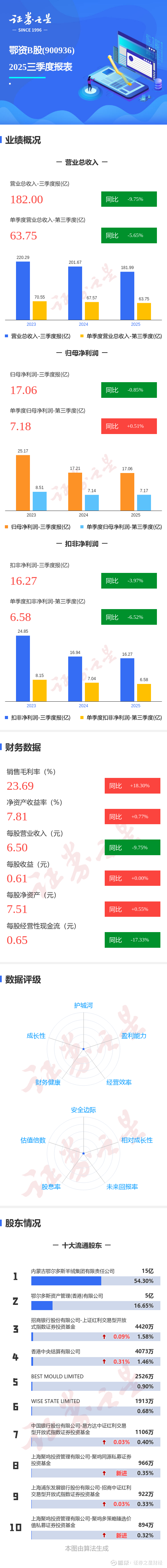 证券之星消息,鄂资B股2025年三季报显示,前三季度公司主营收入182.0亿元,同比下降9.76%;归母净利润17.06亿元,同比下降0.85%;扣非净利润16.27亿元,同比下降3.98%;其中2025年第三季度,公司单季度主营收入63.75亿元,同比下降5.66%;单季度归母净利润7.18亿元,同比上升0.51%;单季度扣非净利润6.58亿元,同比下降6.52%;负债率45.62%,投资收益7.29亿元,财务费用2411.09万元,毛利率23.69%。