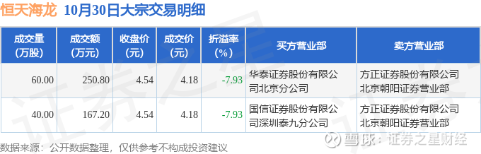 证券之星消息,10月30日恒天海龙发生大宗交易,交易数据如下: