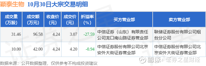 证券之星消息,10月30日颖泰生物发生大宗交易,交易数据如下: