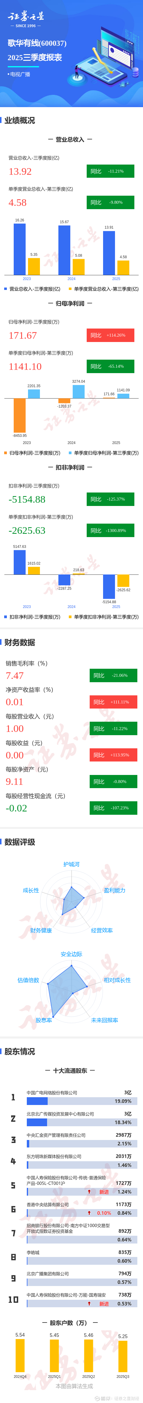 证券之星消息,歌华有线2025年三季报显示,前三季度公司主营收入13.92亿元,同比下降11.22%;归母净利润171.67万元,同比上升114.27%;扣非净利润-5154.88万元,同比下降125.37%;其中2025年第三季度,公司单季度主营收入4.58亿元,同比下降9.8%;单季度归母净利润1141.1万元,同比下降65.15%;单季度扣非净利润-2625.63万元,同比下降1300.89%;负债率19.51%,投资收益1334.53万元,财务费用-4431.66万元,毛利率7.47%。